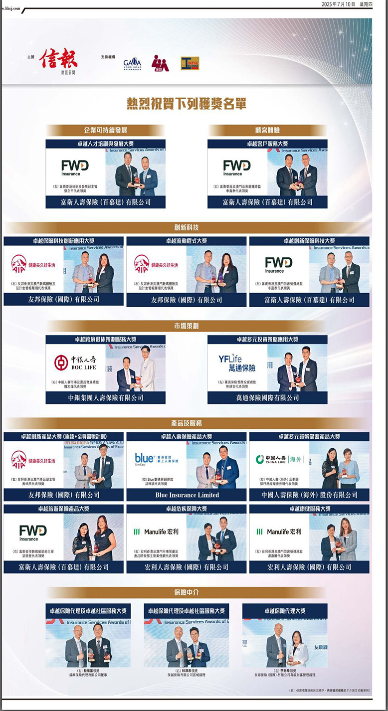 《信報財經新聞》首屆【保險服務卓越大獎】卓越保險代理及卓越社區服務
